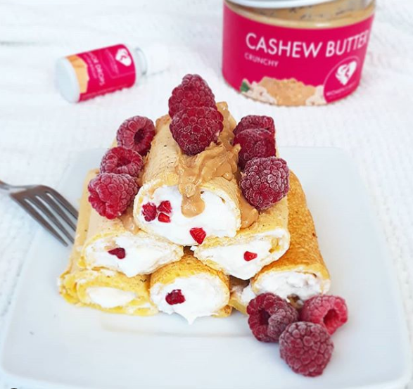Delikatne, waniliowe naleśniki z twarożkiem, malinami oraz przepysznym masłem orzechowym @womensbest.😍