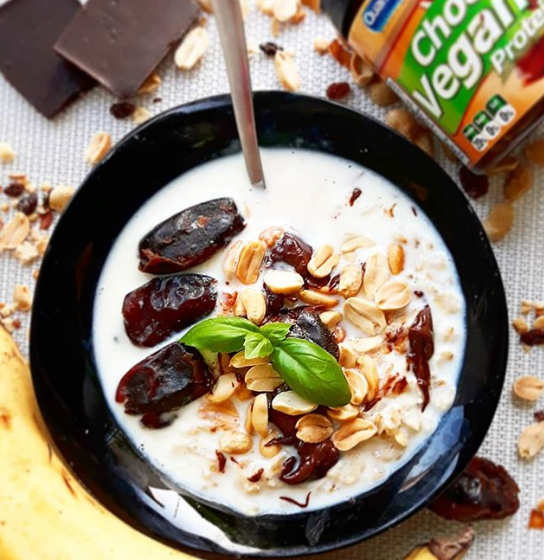 ✔50g płatków owsianych ✔200ml mleka/napoju roślinnego ✔30g daktyli suszonych ✔łyżeczka masła orzechowego ✔15g orzeszków ziemnych ✔wegański krem proteinowy @quamrax_pl ➡️Płatki owsiane ugotować na mleku. Dodać suszone daktyle i masło orzechowe do gotującej się owsianki. Delikatnie wymieszać i przelać do miseczki. Posypać orzeszkami i dodać krem czekoladowy. I śniadanko gotowe!🤪