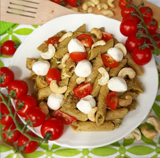 Dzisiaj zamiast ciasta czy naleśników mam tutaj przepis na obiad😏, czyli makaron pełnoziarnisty penne z pesto bazyliowym, mozzarellą, pomidorkami koktajlowymi i orzechami nerkowca!😍