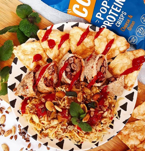 A tutaj nietypowy obiad… pieczony schab z czerwoną fasolą i mozzarellą, do tego makaron z cukinią, czosnkiem i papryką oraz proteinowe chrupki, które po prostu idealnie tutaj pasują!