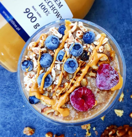 Wczorajszy orzechowy budyń z malinami i borówkami to moja nowa ulubiona wersja!💓 Może to dlatego, że na wierzch dodałam duuużo kremu orzechowego @vitline.pl, który ma przepyszny delikatny smak i idealną konsystencję… Szczerze… nie znam większego orzechowego potwora (bananowo-orzechowego🤣) ode mnie.