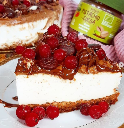 Kruchy spód ciasta jest z herbatników i daktyli, proteinowy sernik z jogurtów i odżywki karmelowej, a na samej górze duuużo dodatków – krem czekoladowo-pistacjowy @superfudgio, czekoladowe kulki, porzeczki czerwone i pokruszone ciasteczka!😍 Zaszalałam z dodatkami, ale dzięki temu ciacho wyszło BOSKIE!💞