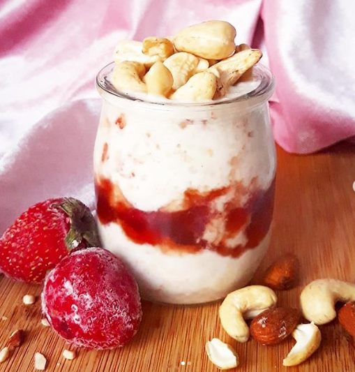 ✔40g płatków owsianych ✔120g jogurtu naturalnego ✔2 łyżki ksylitolu ✔garść orzechów ✔100g truskawek ✔30ml białka ➡️Płatki owsiane zalać wrzątkiem nieco ponad ich poziom i odstawić na 10 minut. Wymieszać z jogurtem i ksylitolem. Białko ubić na sztywno i połączyć owsianką. Truskawki zblendować z odrobiną wody. wszystko warstwowo przełożyć do naczynia i udekorować orzechami.