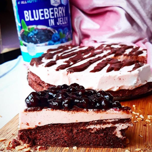 Puszysty, delikatny biszkopt kakaowy z samych białek oraz proteinowy waniliowy sernik na zimno, a do tego pyszny dżem jagodowy @allnutrition, o którym już nie raz wspominałam.