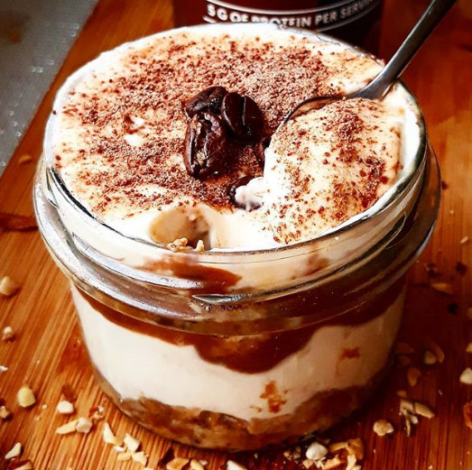✔35g płatków owsianych ✔100ml zaparzonej kawy/espresso ✔2 łyżeczki ksylitolu ✔70g ricotty ✔70g skyru ✔25g odżywki białkowej tiramisu ✔sos karmelowy/masło orzechowe w proszku ✔łyżeczka kakao ✔2 biszkopty ➡️Płatki owsiane zalać wrzątkiem i odczekać, aż napęcznieją. Przełożyć płatki do naczynia, wymieszać z ksylitolem i kawą.