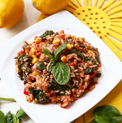 Właśnie taki prosty i szybki jest mój dzisiejszy obiad, czyli risotto z mięsem mielonym, pomidorami, szpinakiem i kukurydzą.