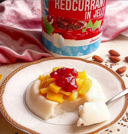 Waniliowy pudding z kaszy manny na mleku, do tego mango i czerwone porzeczki, które idealnie przełamują smak deseru🍨.