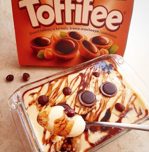 Delikatny krem waniliowy z budyniem, kruche herbatniki, krem orzechowo-waniliowy, orzechy laskowe, pyszna polewa karmelowa i.. toffifee.😏