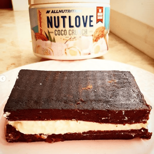 krem: ✔150g twarogu ✔100g skyru ✔20g odżywki białkowej/skrobi ✔2 łyżeczki kremu Nutlove @allnutrition ✔2 łyżeczki erytrytolu ➡️Wszystko zblendować i posmarować kremem połowę ciasta, drugą połową przykryć i pokroić w prostokąty. Smacznego.