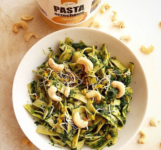 Dzisiaj obiadowy przepis… makaron taggiatelle ze szpinakiem, czosnkiem, pastą orzechową i nerkowcami. Obiad zrobicie w 10 minut, wieść naprawdę szybciutko… nawet jedną ręką dacie radę, bo mega prosty przepis!😊