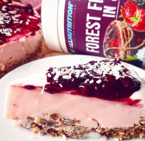Kremowy, delikatny sernik na zimno o smaku malinowym, na orzechowym kruchym cieście, z frużeliną owoce leśne.