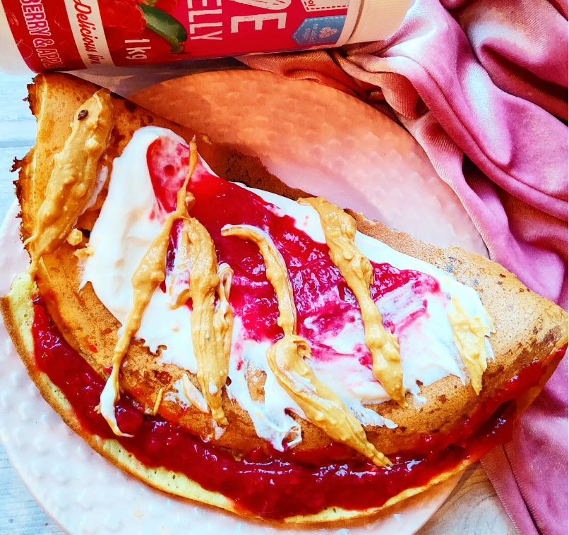 A dodatki to podstawa… Tym razem postawiłam na skyr, dżem malinowo-jabłkowy i ulubione masło orzechowe 😈.