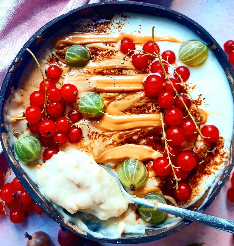 Przepyszna kremowa owsianka z nutą kawy, skyrem waniliowym, a także masłem orzechowym i porzeczkami dla przełamania smaku😍🤤.