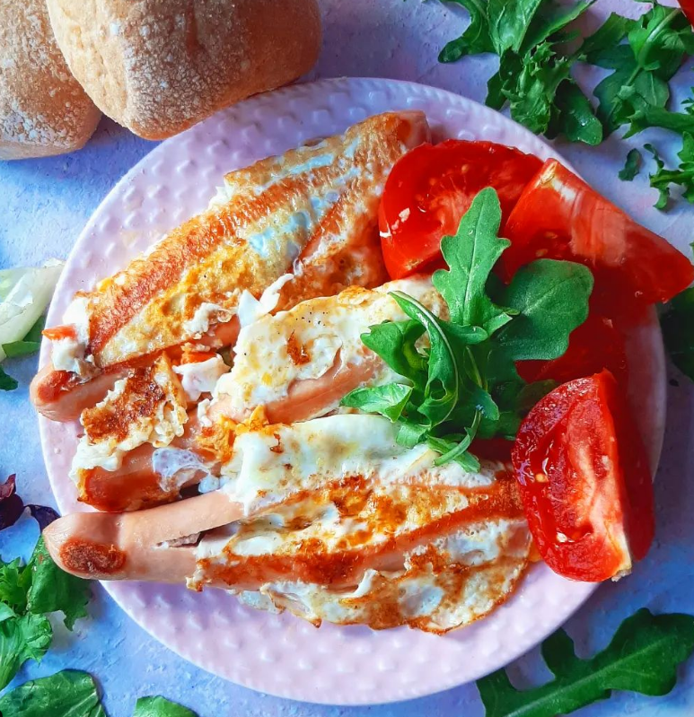 Parówki z jajkiem sadzonym w otoczeniu warzyw, a do tego pyszne bułki śniadaniowe @incola_glutenfree