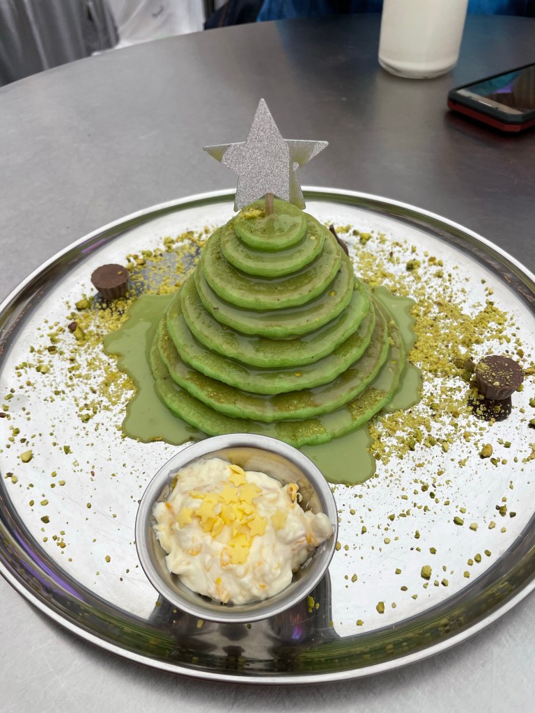 👉Holly Jolly Tree Pancakes, czyli placuszki choinkowe z pistacjami, serkiem oraz boskim sosem czekoladowym. Dodatek Matchy skradł moje serce.