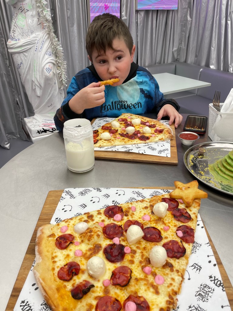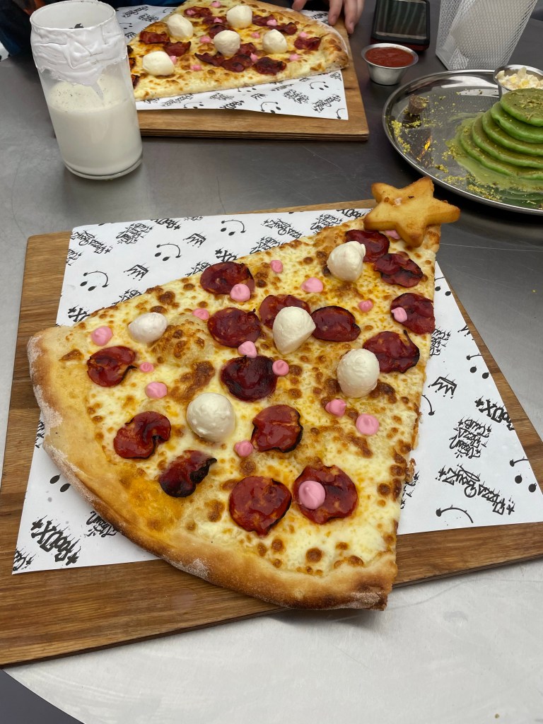 👉Pizzy z bombkami chorizo oraz mini mozzarellą. Podana z włoskim sosem pomidorowym. Dietetycznie to tylko jeden, ale OGROMNY kawałek pizzy. Całość uzupełniła przepyszna gwiazdka ze smażonego sera🔥.