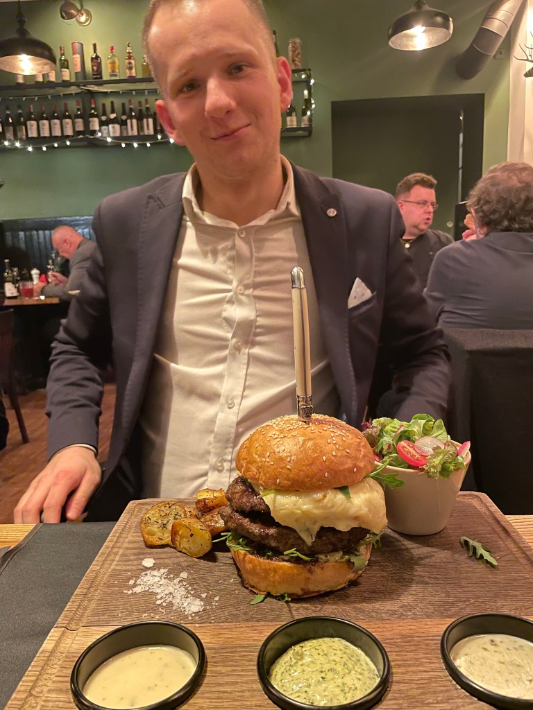 Jedzenie obłędne… szczególnie Burger Rzeźnika z podwójną wołowiną oraz serem podanym przy stoliku.