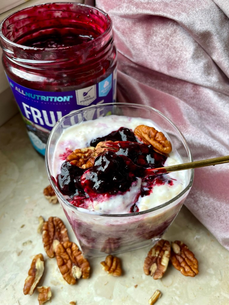 ➡️Płatki zalać wrzątkiem i odstawić na kilka minut. Następnie dodać skyr oraz wiórki kokosowe i wymieszać. Przelać do naczynia, udekorować musem owocowym i włożyć do lodówki na noc.