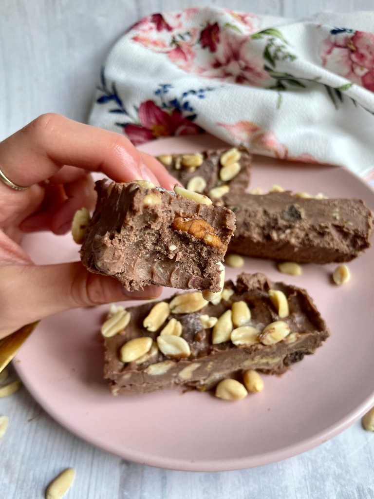 ➡️Rozpuścić czekoladę oraz olej kokosowy. Następnie połączyć z odżywką oraz skyrem i wymieszać do uzyskania jednolitej konsystencji. Dodać orzeszki i opcjonalnie erytrytol. Przełożyć do płaskiego naczynia i schłodzić w zamrażarce przez 30 minut. Następnie pokroić i gotowe!☺️
