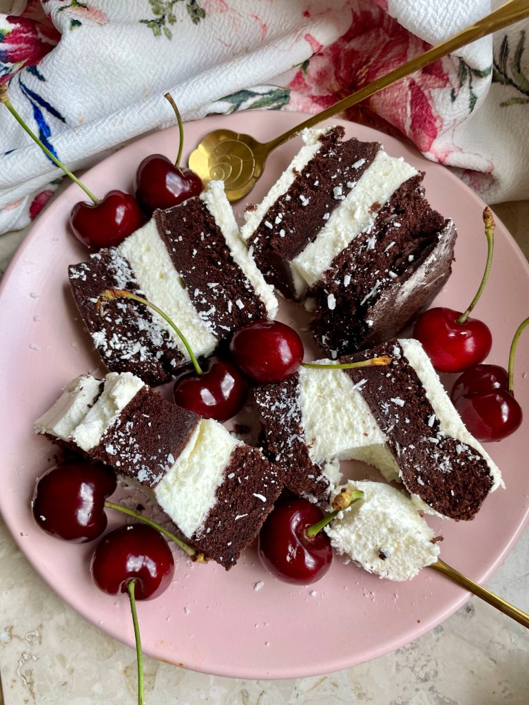 Czekoladowy, puszysty biszkopt przełożony kremową pianką waniliową.