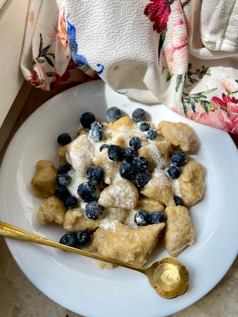 ➡️Składniki zagnieść i uformować rulony, następnie pokroić w kształt kluseczek i gotować we wrzątku kilka minut. Posypać borówkami i polać sosem z jogurtu bez laktozy i aromatu waniliowego.