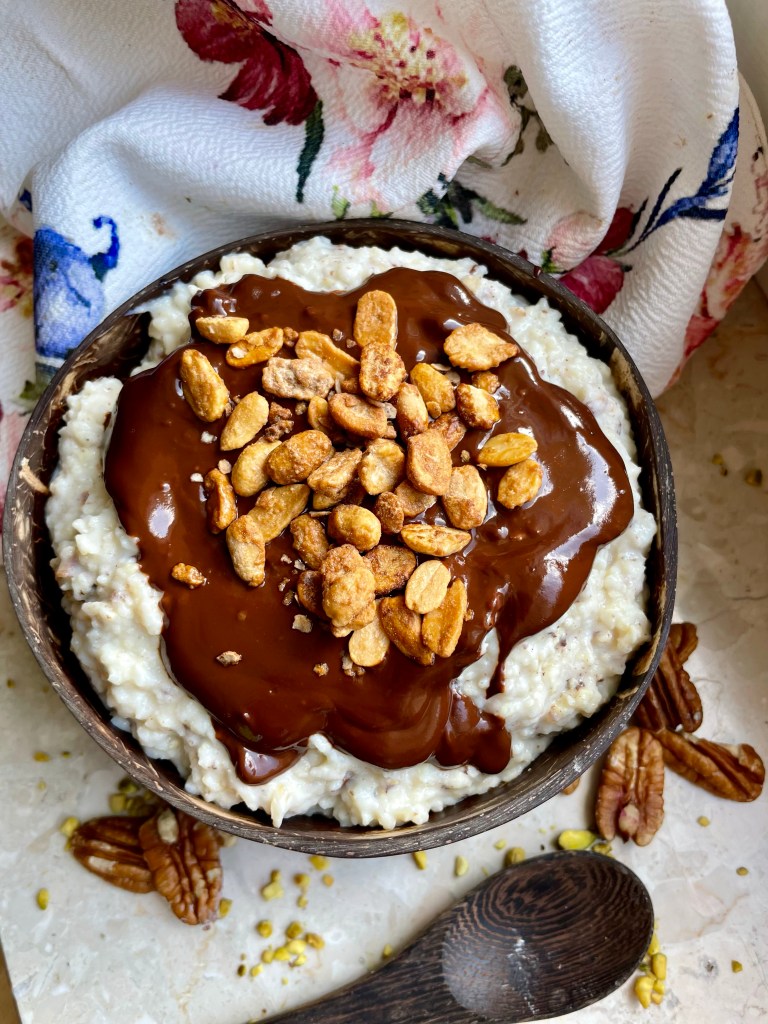 ➡️Płatki ugotować na mleku. Dodać aromat i energicznie wymieszać. Opcjonalnie można dodać odżywkę. Przelać do naczynia, a na wierzch polać rozpuszczoną czekoladą i posypać orzeszkami.