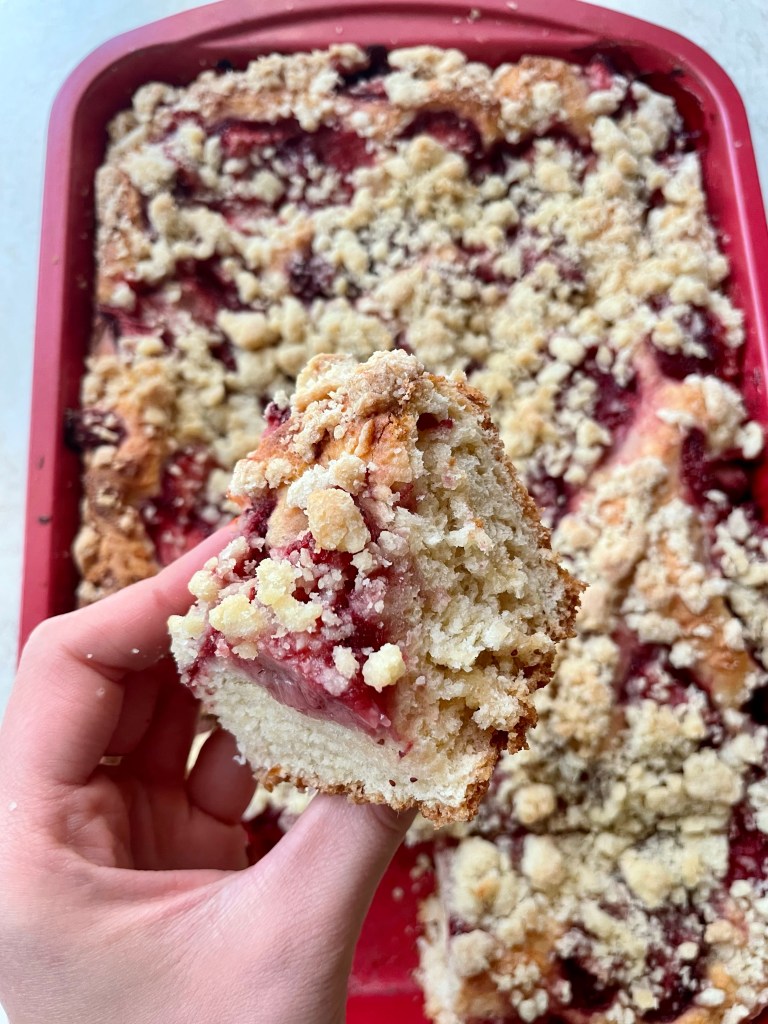 Zagnieść kruszonkę i posypać górę ciasta. Piec w rozgrzanym do 180 stopni piekarniku 40 minut.