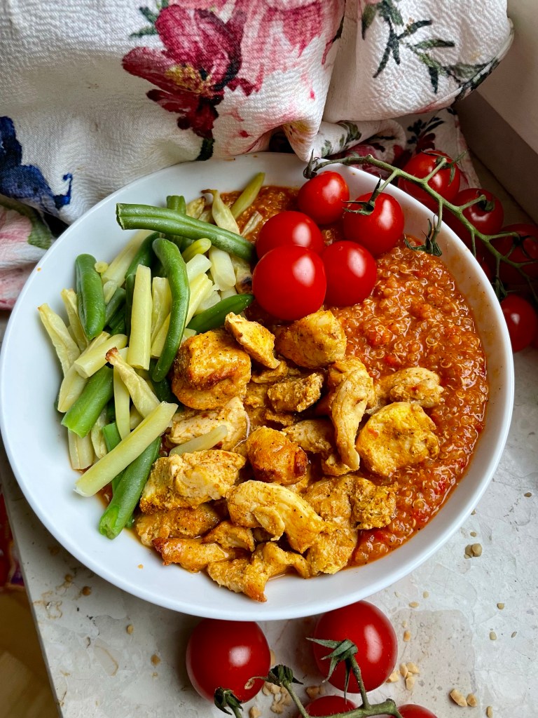 Lekkostrawna, odżywcza, pyszna komosa ryżowa w sosie paprykowym, a do tego świeża fasolka i grillowany kurczak😍