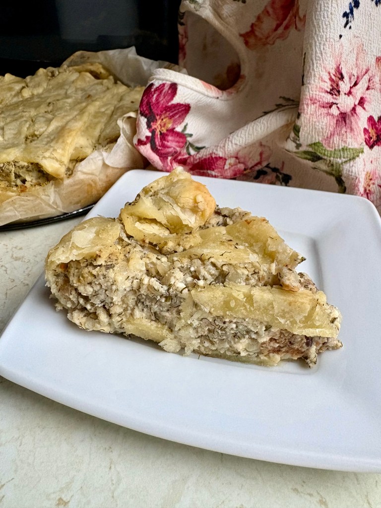 ➡️Ciasto wyłożyć na spód formy. Cebulkę posiekać drobno i zeszklić na patelni. Ziemniaki połączyć wraz z twarogiem i fetą. Dodać cebulkę, koperek i jajko. Następnie przyprawić do smaku i przełożyć do formy z ciastem. Przykryć kolejną warstwą i piec 35 minut w 200 stopniach.