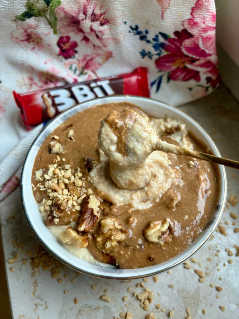 ➡️Płatki zalać napojem i ugotować do zgęstnienia. Dodać aromat oraz odżywkę, po czym zblendować na gładki krem. Przełożyć 2/3 do naczynia, a do reszty dodać kakao oraz kawę i wymieszać. Przelać na wierzch budyniu i orzechami udekorować jaglankę. Smacznego!