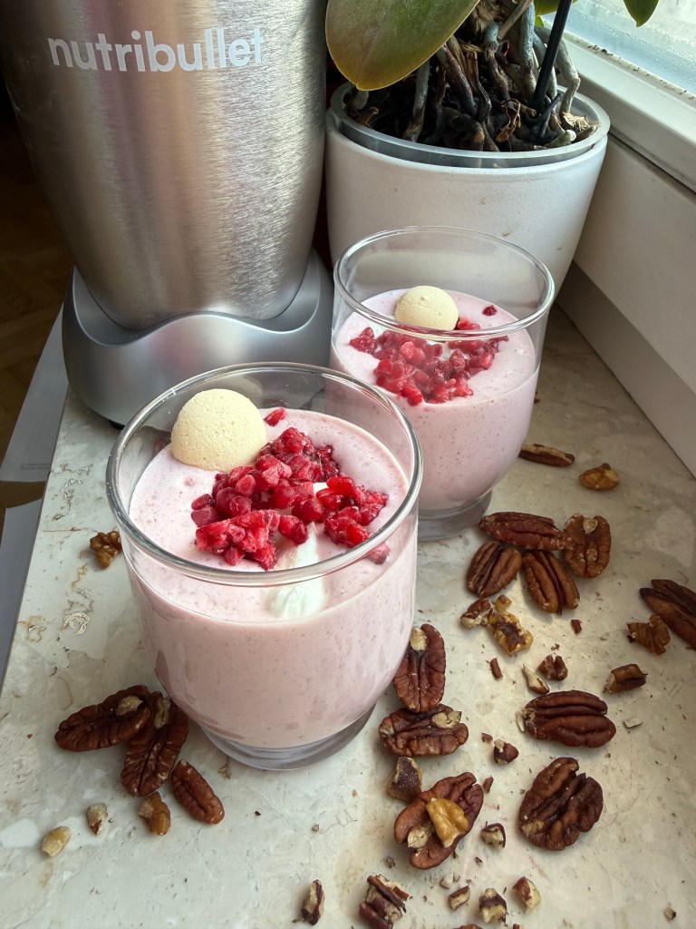 Mój ulubiony sposób na niskokaloryczną i proteinową przekąskę – koktajl z mrożonych owoców 🩷🥤