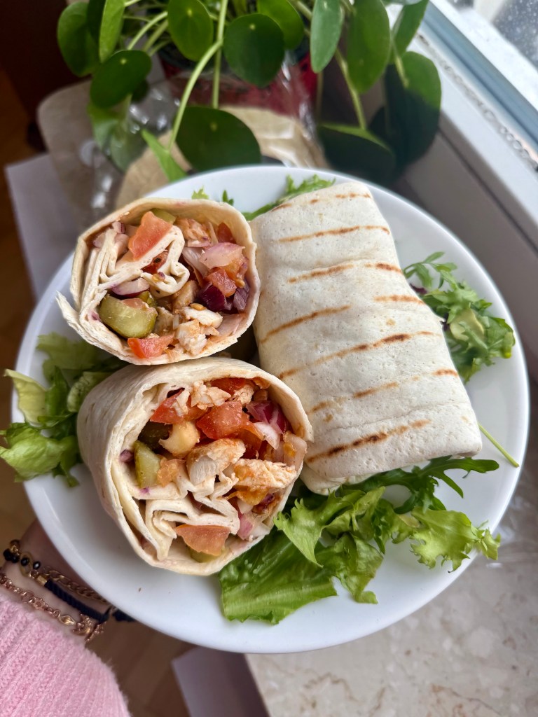 ➡️ Kurczaka pokrój, dopraw przyprawą gyros i usmaż na złoto. Warzywa pokrój w paski. Tortillę BeKeto podgrzej na suchej patelni. Nałóż sałatę, kurczaka, warzywa i polej sosem. Zawiń, przekrój na pół i… gotowe!