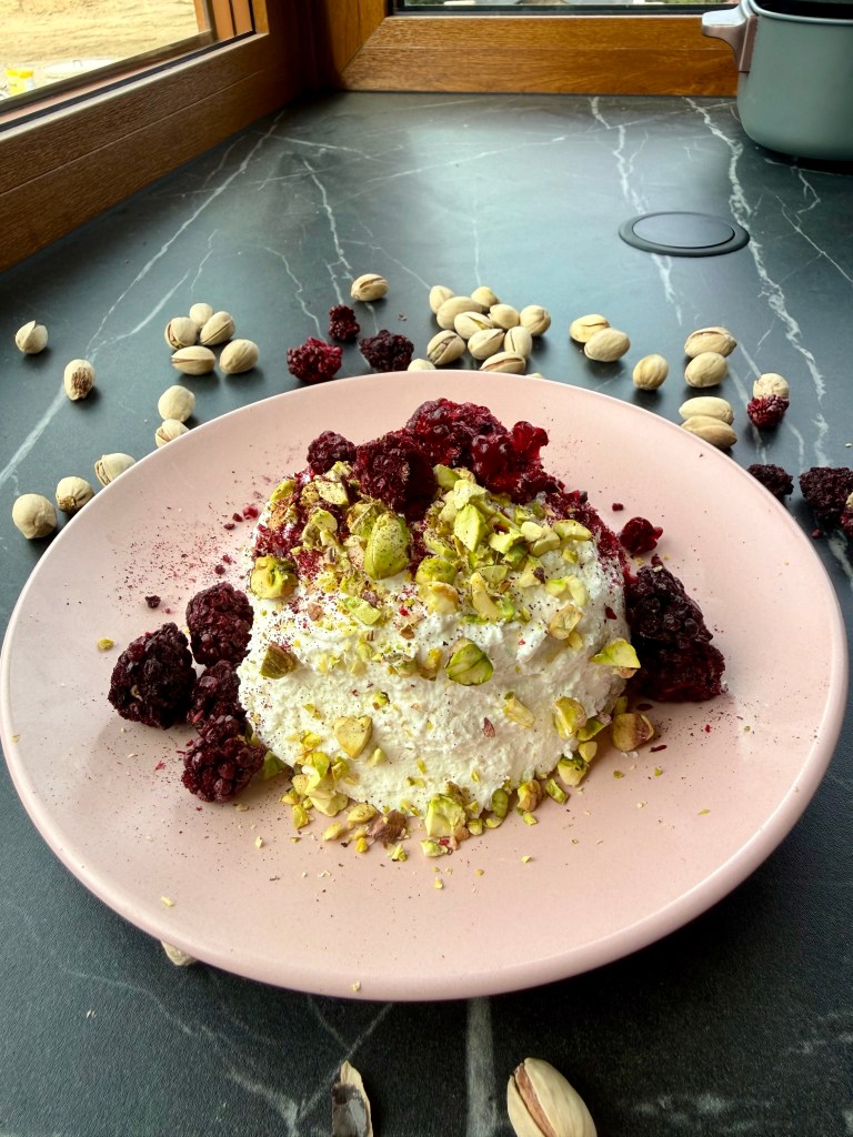 ➡️ Składniki włóż do blendera kielichowego i zblenduj wszystko na gładką, kremową masę, dodaj bakalie, przełóż do foremki i schłódź w lodówce. Posyp pistacjami i owocami liofilizowanymi. Gotowe! 🙌